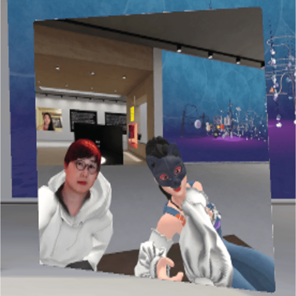 [Left] Virtual selfie with Hayoun Kwon as 3D avatars in a VR gallery